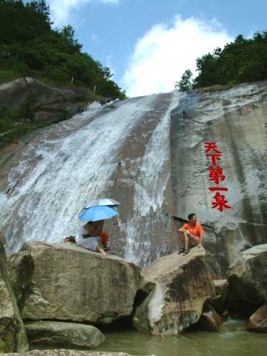 水簾洞瀑布源頭,在紫蓋峰的泉水。三支泉水匯集一起,流入水簾洞上方谷地。谷地闊三丈,原是梁朝的九位真人白日飛升的棲息之地,后建造九仙觀。九仙觀附近有太陽泉、洗心泉、洞真源、仙人池等。相傳泉水深不可測(cè)。泉水從石壁上飛流直瀉,發(fā)出雷鳴般的聲音,聲傳十里。明朝張居正游此地后說:“瀑泉灑落,水簾數(shù)疊,掛于云際,垂如貫珠,霏如削玉”。確實(shí),它從絕壁上噴瀉下來,寬達(dá)三太,高五十余米,瀉珠濺玉,仿佛一幅巨大的白布簾,在石壁當(dāng)中被亂石嶙巖擋住,然后再?gòu)氖p里屈曲折射,跳躍出來,滿谷水花四濺,閃爍著晶瑩奪目的光彩。水簾絕壁下的碧潭,天上的云彩和兩邊的蒼翠的山巒,構(gòu)成一幅美麗的山水畫。明朝張居正作《水簾洞》一贊道:“誤疑瀛海翻瓊浪,莫擬銀河倒碧流;自是湘妃深隱處,水晶簾掛五去頭”。這首詩可說是寫出了水簾洞的光、聲、影三絕的奇景了。