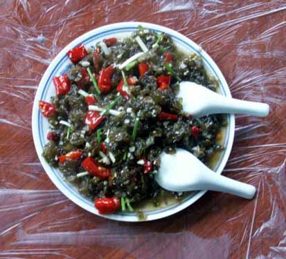 【 酸辣子炒沙蘿菇 】 當?shù)卮合募居旰螅筋^巖石壁上生長的墨綠色地菇——地衣(本地名為沙蘿菇),采集后用清水反復多沖洗幾次。再用壇子腌的酸辣椒和大蒜一起炒熟,出鍋后灑些許香蔥即成一道色、香、味俱全的地方特色小吃。