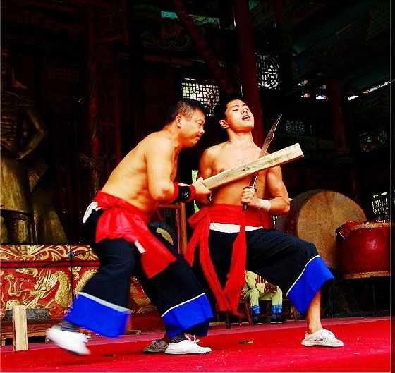 大庸氣功 大庸氣,堪稱(chēng)武林奇葩,曾為祖國(guó)贏得聲譽(yù),海內(nèi)外享有極主名望。 大庸氣功是大庸各民族特別是土家族傳統(tǒng)體育項(xiàng) 目之了,分健體氣派、武術(shù)氣功兩類(lèi)。前者有“返還 功”、“馬王推氣功”、“少林達(dá)摩醫(yī)療保健氣功” 等;后者有靜坐、壁虎、靈子、二指彈、碎石、松靜 、硬氣、五禽、五陽(yáng)功等,尤以硬氣功著稱(chēng)。大庸硬 氣功,歷史悠久,漢代相單程,明代覃后,清代劉明 燈,當(dāng)代湯子模、周鐵鞭、杜心武、趙繼書(shū)等都具有 超人硬氣武功。大庸土著民族在漫長(zhǎng)的反征服、反壓 迫斗爭(zhēng),博采武當(dāng)、少林南北派、昆侖派眾家武林精 華,創(chuàng)造出獨(dú)此一家的大庸硬氣功。 據(jù)傳,大庸硬氣功鼻祖是楚國(guó)鬼谷子?!?a class="insidelink" href="http://xinyumofangjiaoyu.cn/cityinfo/15580531721.html" title="永定區(qū)">永定縣 志》有關(guān)鬼谷子隱居天門(mén)山鬼谷洞潛心學(xué)《易》、傳 授方術(shù)的記載。到清代有武林高手朱茂嶺,隱居三岔 村北芭蕉灣洞,研究鬼谷氣功之術(shù),后收西溪坪胡口 子、余世萬(wàn)(即“余通人”)為徙,傳其衣缽。余通 人將武術(shù)氣功系統(tǒng)整理,發(fā)揚(yáng)光大,播名于世。 新中國(guó)成立后,黨和政府十分重視民間氣功發(fā)掘 整理,并正式列為體育項(xiàng)目加以普及發(fā)展,今日大庸 市習(xí)練硬氣功達(dá)數(shù)萬(wàn)人眾。永定區(qū)官黎坪村世有“硬 氣功之鄉(xiāng)”盛譽(yù),該村男女老幼,練功已蔚成風(fēng)氣, 其武師趙繼書(shū),1979年先后參加全省和全國(guó)武術(shù)大賽 ,均獲一等獎(jiǎng),受到國(guó)家體委重視,同年7 月趙繼書(shū) 專(zhuān)程到北京給中央領(lǐng)導(dǎo)同志匯報(bào)表演。嗣后,隨同中 國(guó)武術(shù)代表團(tuán)和國(guó)家領(lǐng)導(dǎo)人先后兩次出國(guó),到盧森堡 、意大利、比利時(shí)、羅馬尼亞、馬其他和東南亞等國(guó) 家訪問(wèn)。他表演的臥刀碎石、頭頂開(kāi)石、雙鳳灌耳、 頭碰石柱、叉尖推磨等精彩節(jié)目,博得外國(guó)友人好評(píng) 。盧森堡一位榮獲國(guó)家獎(jiǎng)牌的武士,看了表演后連夜 來(lái)到中國(guó)大使館,將自己珍藏多年的獎(jiǎng)牌贈(zèng)送給他; 盧森堡國(guó)王主動(dòng)熱情走上臺(tái)與趙繼書(shū)熱情擁抱,連連 稱(chēng)贊:“了不起!了不起!國(guó)際氣功大師!”并把珍 藏紀(jì)念章一枚贈(zèng)送給趙繼書(shū)。一位法國(guó)朋友十分贊賞 說(shuō):“中國(guó)的氣功,稱(chēng)為全人類(lèi)的寶貴財(cái)富,是有科 學(xué)道理的。”自此,大庸硬氣功譽(yù)滿全球。湖南瀟湘 電影制片廠專(zhuān)門(mén)拍攝了彩色紀(jì)錄片《大庸氣功》。 大庸硬氣功共有二十多個(gè)項(xiàng)目,最有影響的是: 腹臥鋼叉 由二人在地面扶住一根叉尖朝上的三 股鋼叉,叉尖猁鋒利,然后一個(gè)俯身叉尖,尖抵腹部 ,待其四肢平展懸空,扶叉二人轉(zhuǎn)動(dòng)鋼叉,謂之推磨 。表演時(shí),要求臥叉者運(yùn)氣于腹,氣意集中,稍有大 意,叉即穿腹而過(guò)。 臥刀破石 先固定兩把大刀,刀口朝上,臥刀者 運(yùn)氣后,由其他人抬臥于刀口上(有仰臥、俯臥兩種) ,然后在臥刀者腹部或背部置一碩大石條(約數(shù)百斤) ,一人或兩人輪大鐵錘狠擊石條直至斷裂破碎為止。 釘?shù)洞财剖?地上倒一層碎玻璃片,一人仰臥其 上;然后腹上置釘床,又一人仰臥釘床上,再于第二 人腹上置釘床,第三人仰臥刀床上,腹部上壓一塊數(shù) 百斤大條石,由人掄錘狠砸,至石破為止。 銀槍刺喉 用一根兩頭安有鋒利槍頭的鋼槍?zhuān)?置兩位表演者喉部,然后相對(duì)發(fā)力,至槍桿抵成彎弓 形而喉部安然無(wú)恙。 徙手?jǐn)嗍?表演者將堅(jiān)滑如鐵一塊卵石置于石凳 (地)上,然后運(yùn)氣于掌或指擊斷(碎)卵石。 踢腿斬石 表演者運(yùn)氣于腿,以腿踢斷石條。一 般可踢斷15公分以上厚度的麻石條或青石條。 胸部打刀 將鋒利大刀刃口置于胸部肌肉上,用 一根拳頭粗木棒猛擊刀背,至棒斷而胸部無(wú)傷。 新中國(guó)成立以來(lái),大庸民間武術(shù)與民族體育逐漸 融為一體,發(fā)揮著提高人民身體素質(zhì)、弘揚(yáng)中華武術(shù) 傳統(tǒng)和增進(jìn)國(guó)際友誼重大作用。除硬氣功外,還有數(shù) 十種武術(shù)形式散見(jiàn)于民間武術(shù)體育活動(dòng)之中。如打飛 棒、扭扁擔(dān)、抵搭斗杠、擠油渣、甩抱腰、舉石鎖、 板牛角(一種斗牛形式)等等。其特點(diǎn)是因地制宜, 不分場(chǎng)地,凡田園地角院壩集鎮(zhèn),都是習(xí)武練功、開(kāi) 展活動(dòng)的處所,頗具泥土氣息。擬或以生活中某些動(dòng) 作和動(dòng)物的某種形態(tài),稍加模仿演繹,便成某一獨(dú)特 武術(shù)形式。如天門(mén)武術(shù)功夫大師余道人所創(chuàng)造的“宮 天梳”、“巖燕樸天門(mén)”等;也有就地理特點(diǎn)創(chuàng)造某 種武功形式的,如“蕩藤”等。 以上部分圖片均來(lái)自互聯(lián)網(wǎng),出處不詳,請(qǐng)作者與本站聯(lián)系。 |