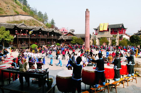 擺手舞是土家族最有影響的大型舞蹈,帶有濃烈 的祭祀色彩。歌隨舞而生,舞隨歌得名。擺手舞產生 于遠古時代,明清時期尤其盛行。清雍正《永順府志》 載:“每歲正月初三至十七日,男女齊集,鳴鑼擊鼓, 跳舞唱歌,名曰擺手”。 擺手舞又名“社巴”。整個活動民祭曲舞蹈、唱 歌等為表演形式,以講述人類起源、民族遷徙、英雄 事跡為內容。祭祀儀式畢,由“梯瑪”或掌壇師帶領 眾人,進擺手堂或擺手坪跳擺手舞,唱擺手歌?!逗?漢書》稱擺手舞為《巴渝擺》;《晉書·樂志》認為 舞曲四篇中就有“予渝”、“弩渝”是離不開武器的 ,故為一種古代戰(zhàn)舞。土人作戰(zhàn)前跳此舞以助長士氣 。 擺手舞分單擺、雙擺、大擺手、小擺手數(shù)種。跳 擺手舞擊大鼓、鳴大鑼、氣勢宏渾壯闊,動人心魂。 舞蹈時手腳呈同邊動作,踢踏擺手,翩躚進退,成雙 成對,意境生動。 擺手舞不僅是民間一種娛樂和健身性質的體育活 動,亦是舞臺上獨樹一幟的藝術奇葩,正是:“擺手 堂前艷會多,攜手聯(lián)袂緩行歌。鼓鑼聲雜喃喃語,裊 裊余音嗬囈嗬。”