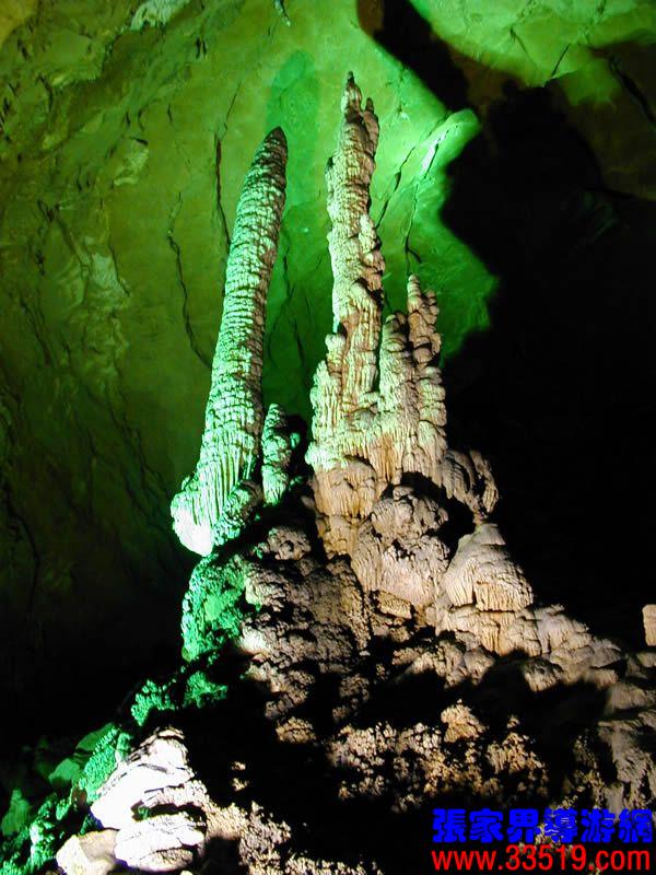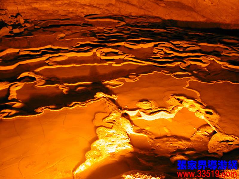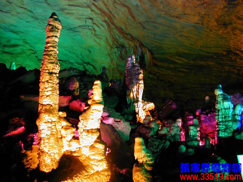(龍宮)龍宮是黃龍洞十三個(gè)大廳中最大的一個(gè),也是景色最美的景點(diǎn)之一,底面積15000平方米,平均高40米,兩千余根石筍拔地而起,千姿百態(tài),異彩紛呈,或如飛禽走獸,或如宮廷珍藏,有的像巍巍雪松,有的像火箭升空。龍宮后園有金銀兩座花池,清水常溢,花簇盛開。宮頂鐘乳柳垂簾掛,四周壁畫栩栩如生。溶解著各色各樣的礦物質(zhì)的水,從巖層中滲透出來(lái),滴落下來(lái)。礦物質(zhì)在洞頂凝固結(jié)晶成倒懸鐘乳石,從鐘乳石滴落的水又把礦物質(zhì)澆疊、堆壘在洞底,而長(zhǎng)成節(jié)節(jié)向上的石筍。大家看看這龍宮的造型,領(lǐng)略這磅礴的氣勢(shì)。洞內(nèi)最大石筍,高12米、直徑10米的漢白玉天然石椅“龍王寶座”居高臨下,眾多石柱石筍似人似物,維妙維肖,圍著寶座朝拜山呼,幾十座珊瑚亭亭玉立,儼然一支龐大的“宮廷樂隊(duì)”。湖南著名教授羊春秋先生作《寄生草》詞對(duì)此進(jìn)行描繪:“百態(tài)千姿模樣,三宮六院門巷。龍王開宴設(shè)瓊漿,猴王偷果鬧天堂,君王納寵擁羅帳。搬演了人間爭(zhēng)攘,匯集了天下奇觀。”
