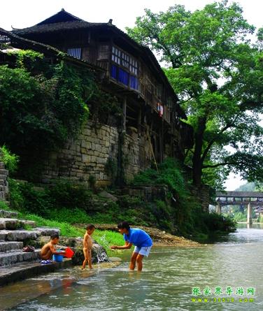 民宅多為吊腳木樓,依山傍水而建,臨河者倒影澄潭如水中街市,依山者雄峙高崖似空中樓閣。兩條河潔凈透亮,其中小河尤為美麗,青山夾岸,綠水長流,河畔蓼紅芷白,桂馥蘭芳,素有“香溪”之稱。其水盡來自溶洞,距街三里之內,就有魷魚洞、犀牛洞、王家洞、向家洞幾股洞泉和一個叫“雞屎潭”的溫泉。 “雞屎潭”來有濃重的硫磺味,水溫如沸,除污力極強,根本不需肥皂便能將汗?jié)n洗得干干凈凈,并能醫(yī)治瘡疥,維護皮膚健康。河中多魷魚,肉嫩且肥,立冬前盡逆水潛入溶洞起冬,立夏前兩三天則成群結隊隨夏汛而出,鄉(xiāng)人在洞口安上網(wǎng)壕,只需“守株待兔”,便能得到豐盛的收獲。在20世紀70年代以前,有時每天可得幾百斤。 小河灘多流急,是漂流的極佳去處。
