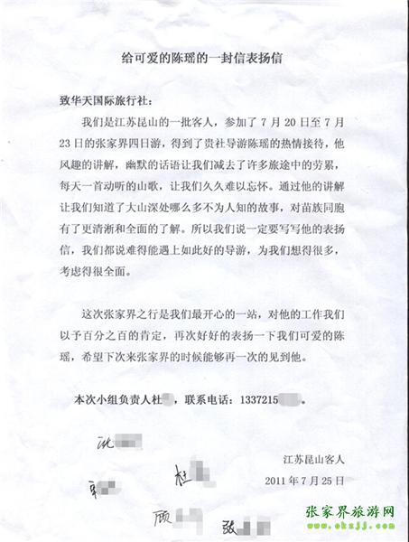 - 游客夏先生為表揚(yáng)導(dǎo)游李姣姣寫來表揚(yáng)信致我張家界... [14811]
