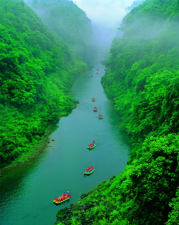 7點(diǎn)準(zhǔn)時(shí)等在萊頓大酒店門(mén)口,猛洞河漂流180元/人,漂流的車(chē)一般會(huì)來(lái)接參加漂流的客人的,上了車(chē)已經(jīng)有好幾位游客,然后車(chē)子又去接了幾位,7:30人接齊,離開(kāi)張家界去猛洞河,車(chē)程約1個(gè)半個(gè)小時(shí),漂流約2個(gè)半小時(shí)。在萊頓大酒店的那個(gè)晚上張家界半夜打雷下雨,我們想今天水很大,漂流會(huì)很刺激。到了那邊才知道上游建了水壩調(diào)節(jié)水量搞平均主義,所以漂流的驚險(xiǎn)度一般般了,后來(lái)去鳳凰公路上比較顛簸,我戲稱(chēng)可以將車(chē)當(dāng)船補(bǔ)足漂流的感覺(jué),呵呵。不過(guò)瀑布因此壯觀不少,漂流沿途至少見(jiàn)到有七八條瀑布,非常漂亮。